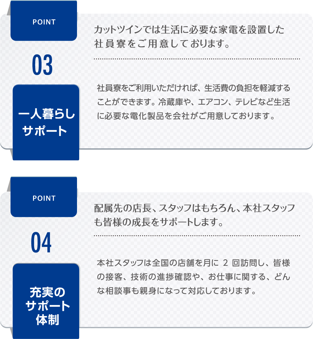 ・理容師は、健康さえ維持すれば、一生できる仕事です。カットツインでは、60歳定年後でも、希望者は再雇用しています。